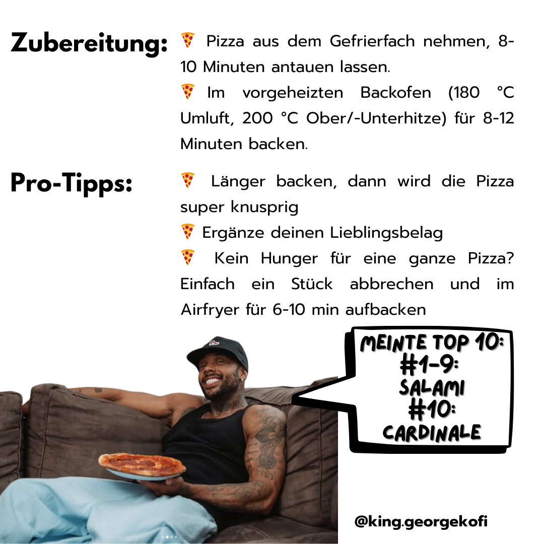 Einmal zu Hause angekommen: Ofen vorheizen, Pizza rein, genießen – voller Geschmack, volle Gains, ohne Wartezeit.