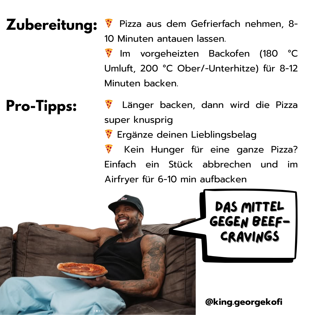 Einmal zu Hause angekommen: Ofen vorheizen, Pizza rein, genießen – voller Geschmack, volle Gains, ohne Wartezeit.